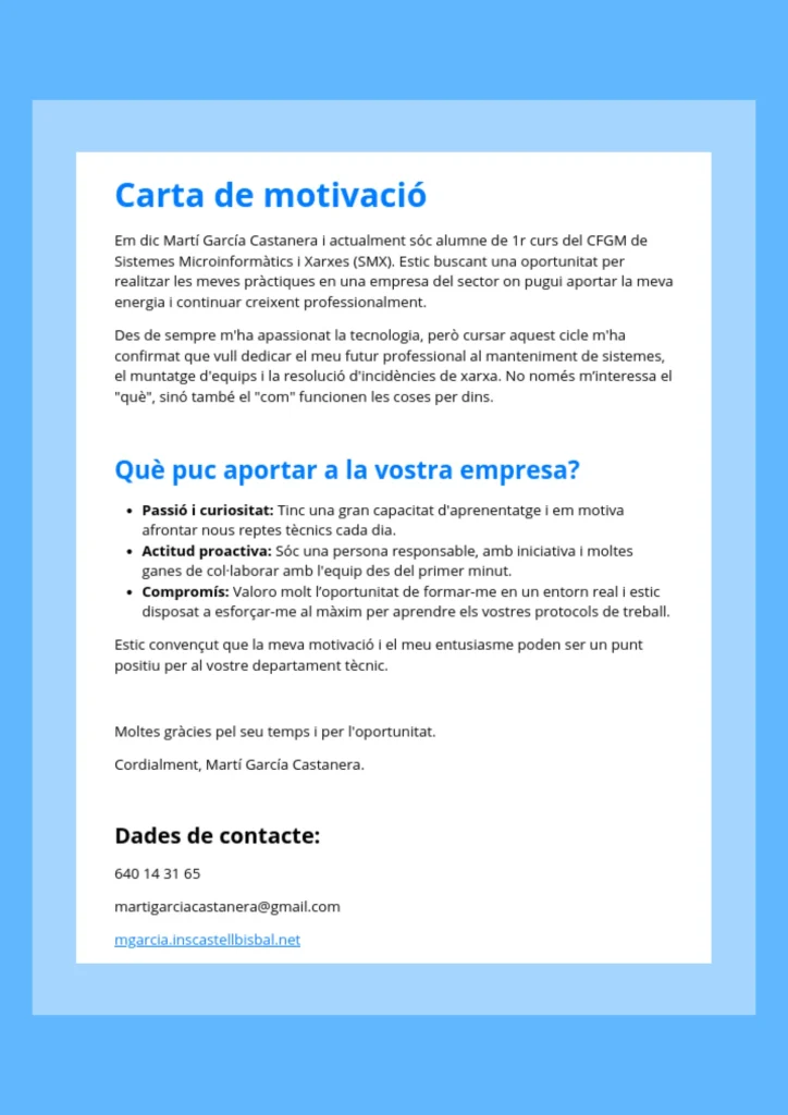 Sóc actualment un estudiant de l’institut de Castellbisbal, que està fent el cicle de 1r d’SMX, tinc molt interès a trobar un lloc per a fer les meves pràctiques.