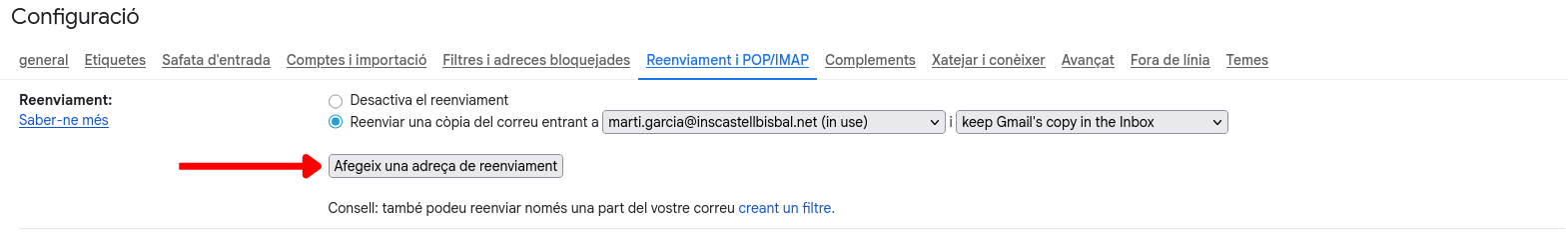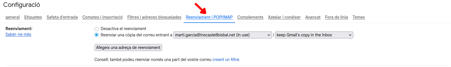 Configuració de redirecció al correu corporatiu Primer has d’entrar en la configuració del correu. Un cop en configuració has de fer clic en la pestanya “Reenviament i POP/IMAP. Després has de fer clic en “Afegeix una adreça de reenviament” i afegir el compte al qual vols que siguin redirigits els correus.
