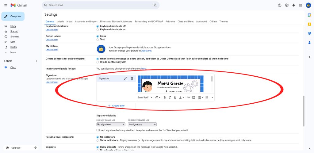 Configuració d’una signatura Per crear la signatura del correu professional he seguit el mateix procediment que amb la signatura corporativa. Com fer la signatura