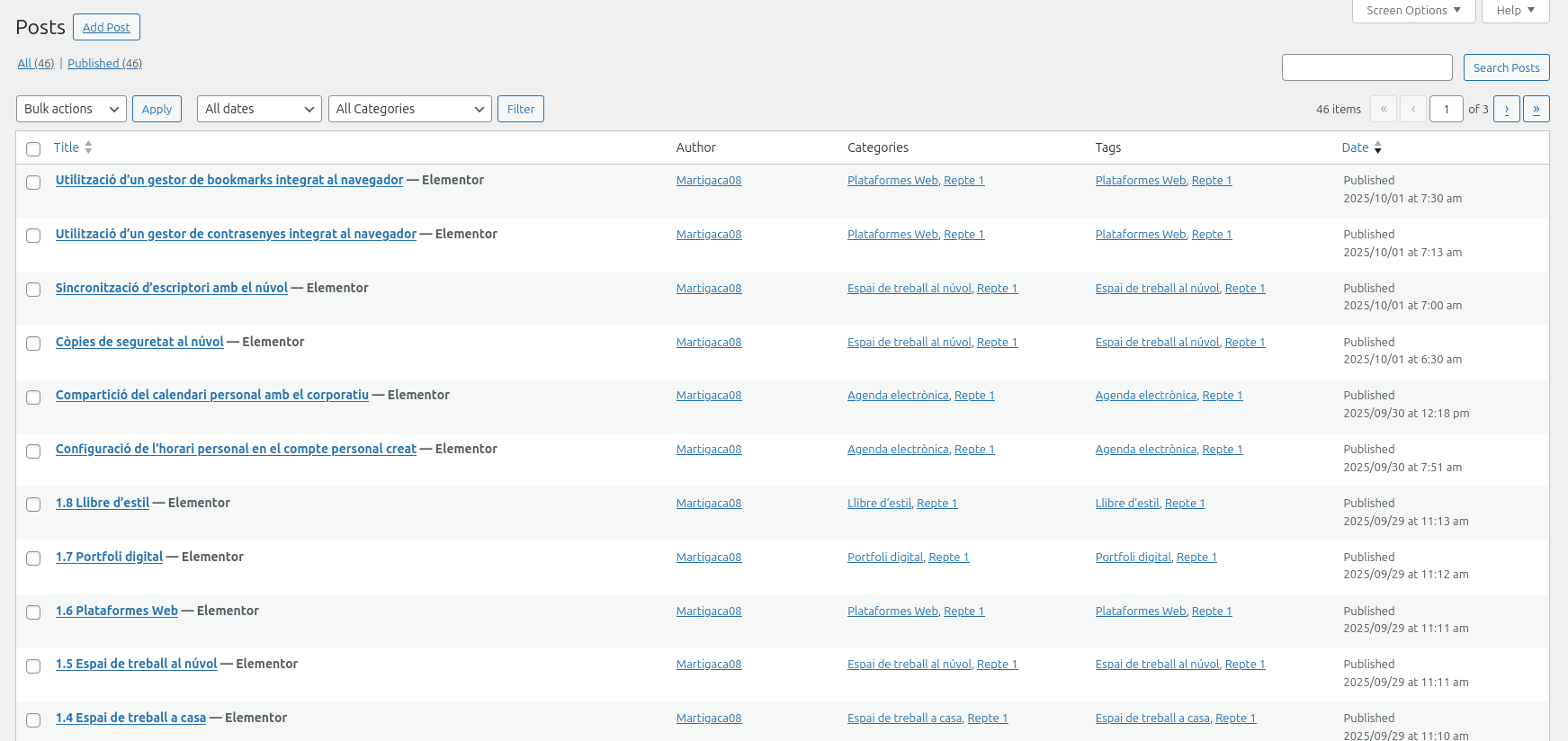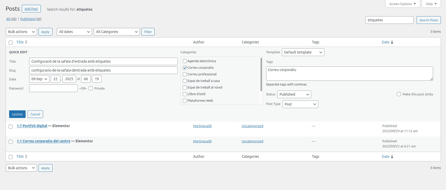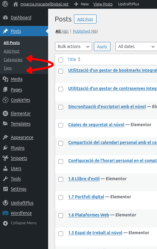 Creació d’etiquetes per categoritzar les entrades Aquests són els meus “posts” els quals he categoritzat. COM FER-HO: He creat les categories i les etiquetes, que bàsicament serveixen per poder tenir tot ben organitzat.