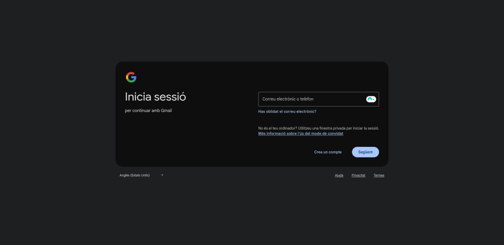 Ves a la pàgina “Gmail” i a la pàgina d’inici de sessió fes clic en “Crea un compte”.