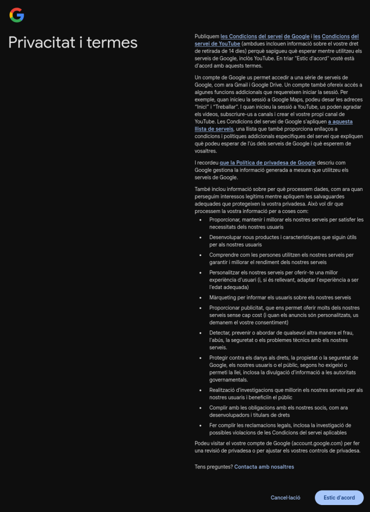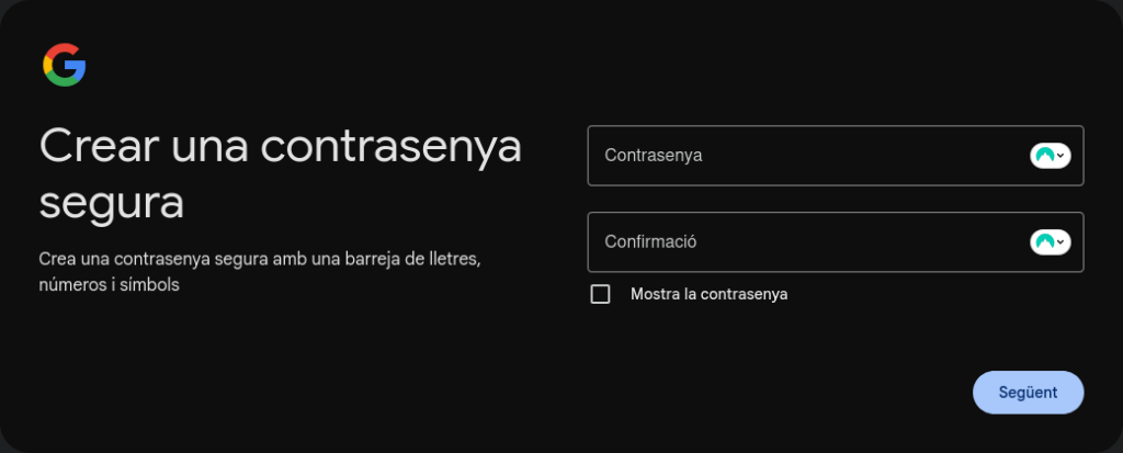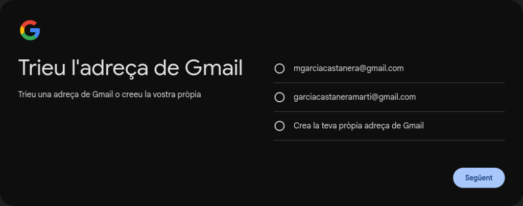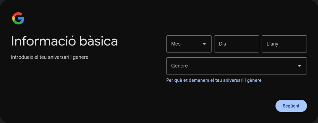 Introdueix la informació requerida (nom i cognom, data de naixement i gènere, adreça que vols crear, contrasenya i confirmació de la contrasenya).