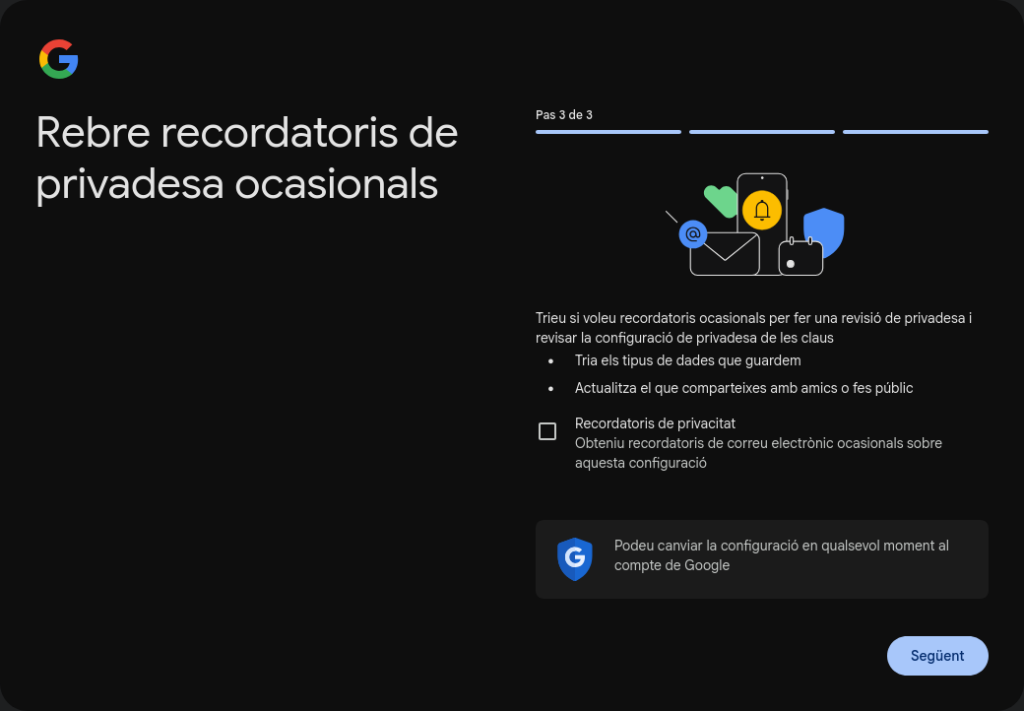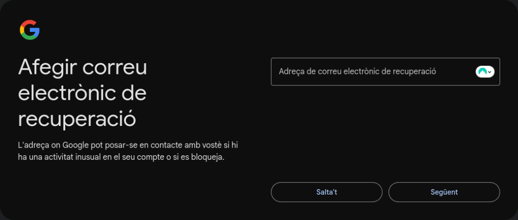 Després has d’omplir la informació opcional com el número de telèfon amb el qual posteriorment farem la verificació i també hem d’afegir una adreça de correu electrònic de recuperació.