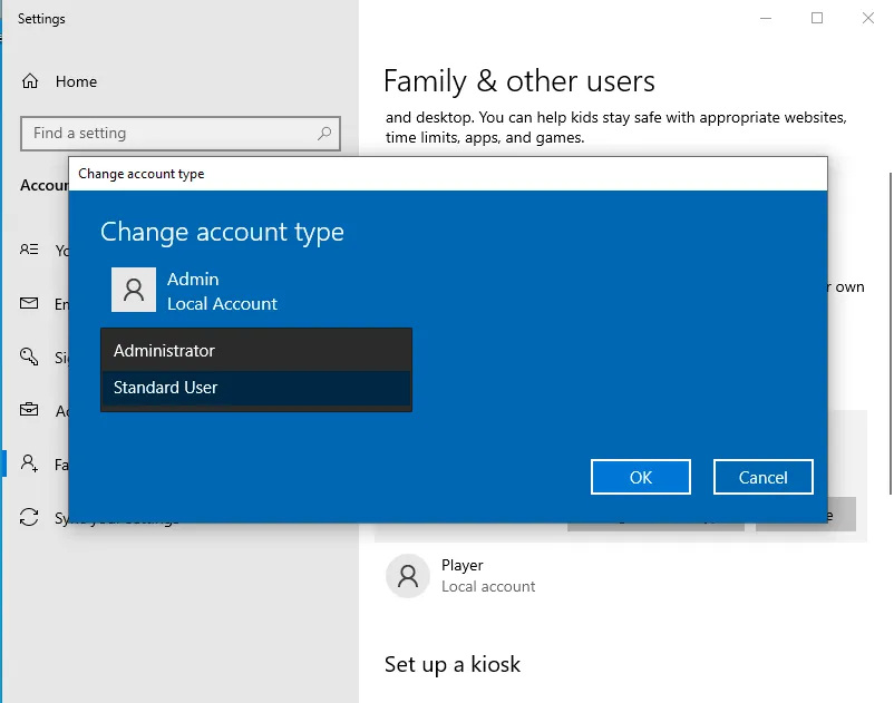 Al donar-li a Change account type s’obrirà una finestra blava on podem canviar el tipus clicant sobre el desplegable i posant administrador.