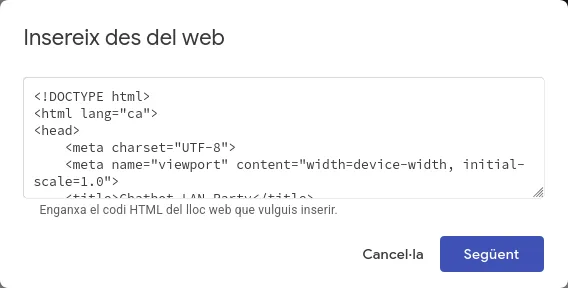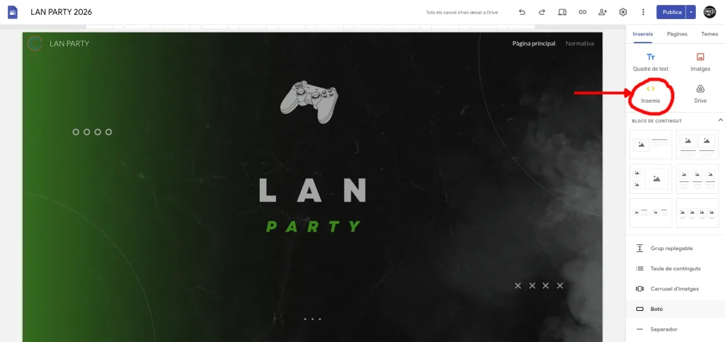 Per integrar el xatbot només hem d’anar al Google Sites i a insisteix codi, introduïm el codi i desem els canvis.